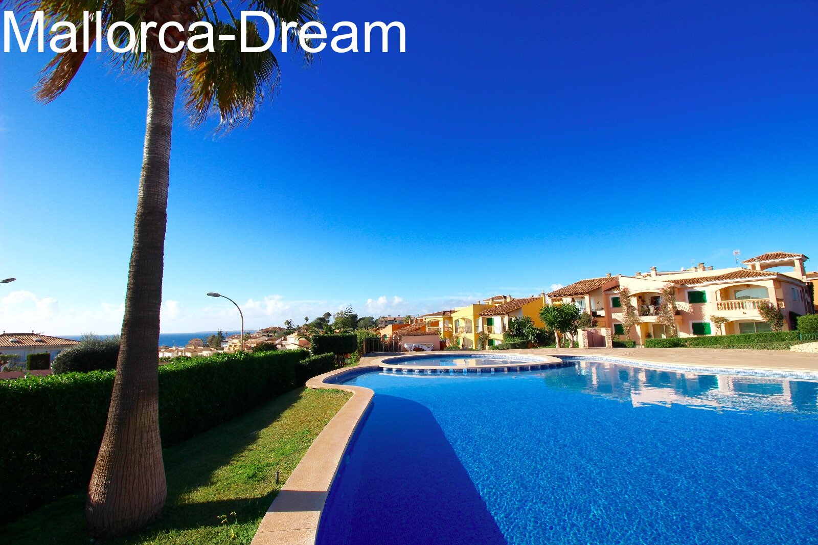 Porto Cristo Novo: Penthouse apartment with private roof terrace, sea view, palm-lined pool + parking space in a top complex