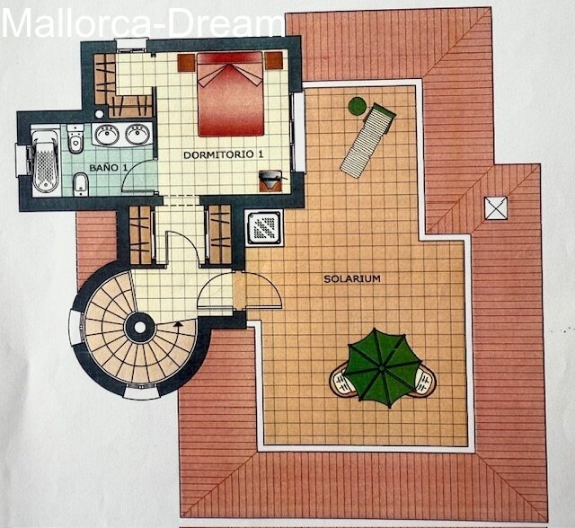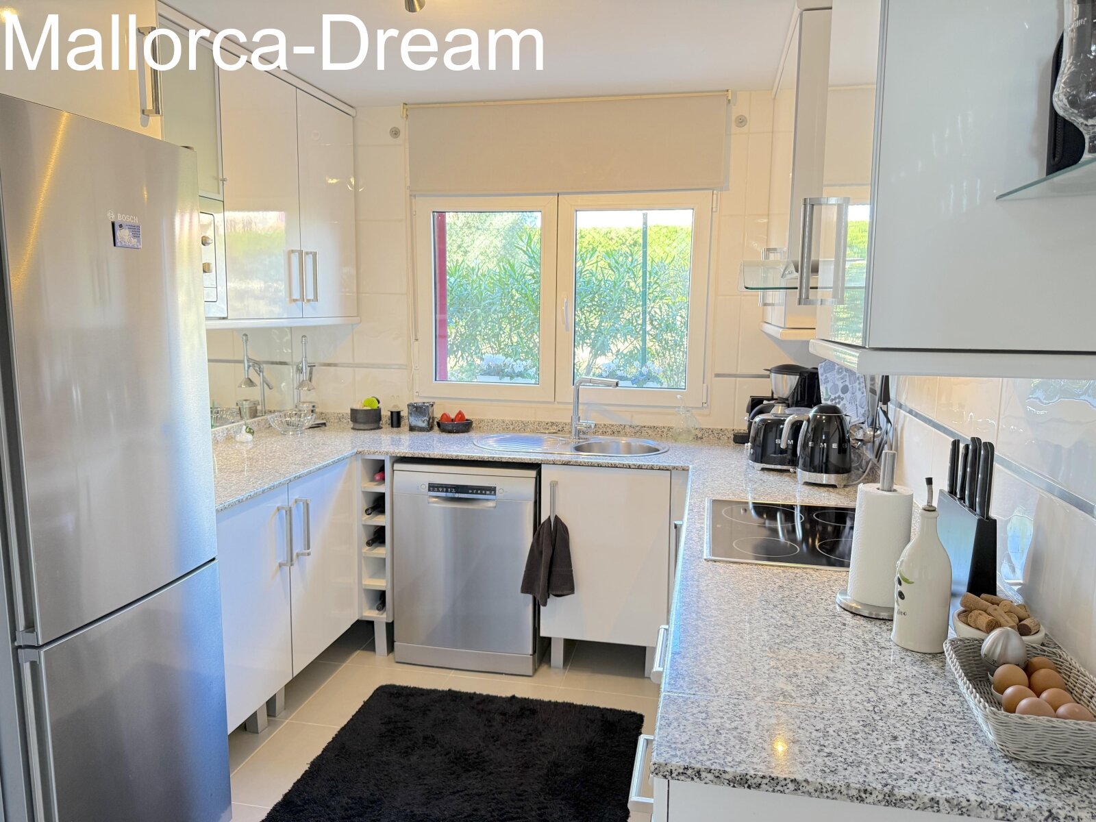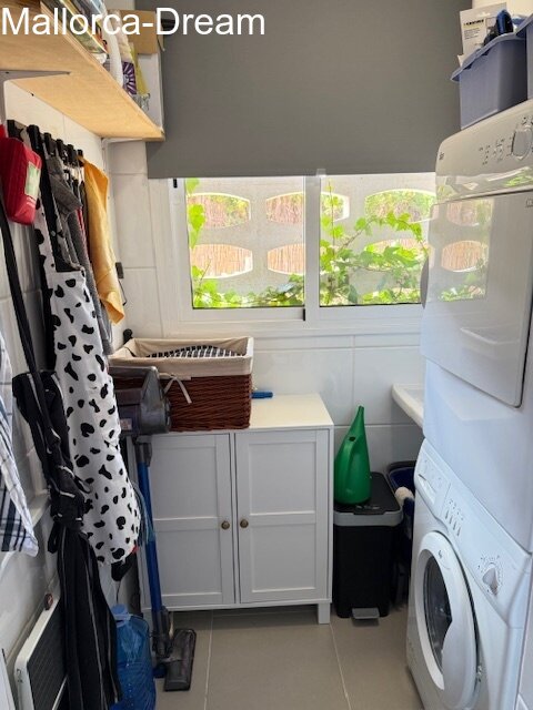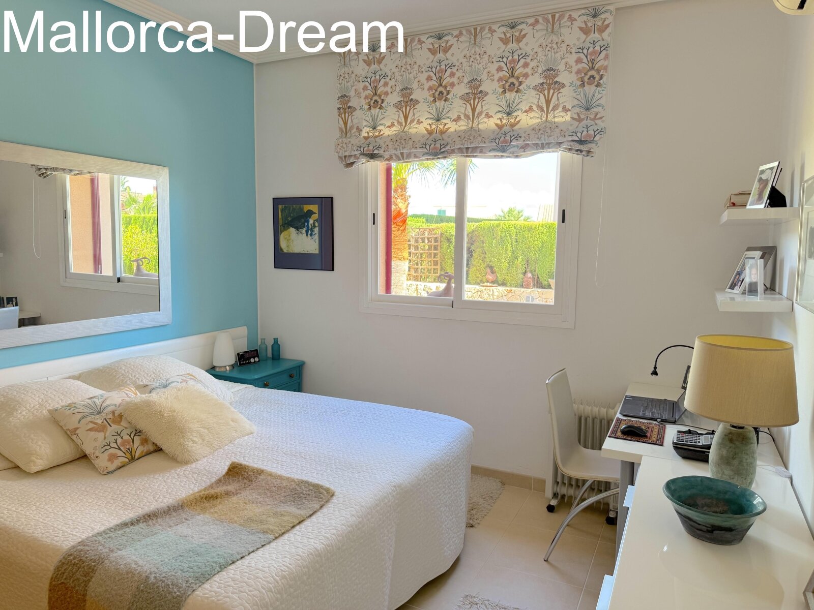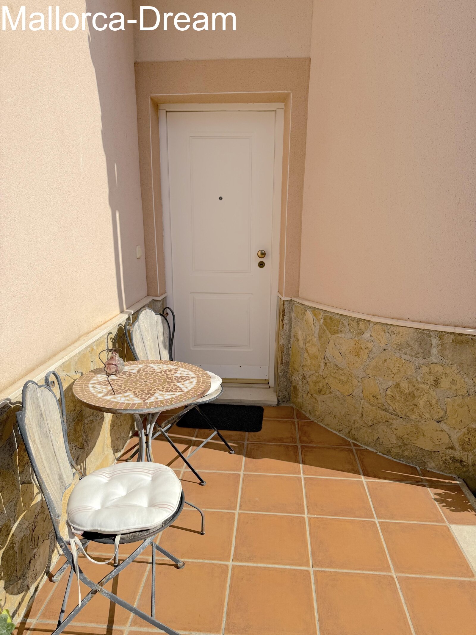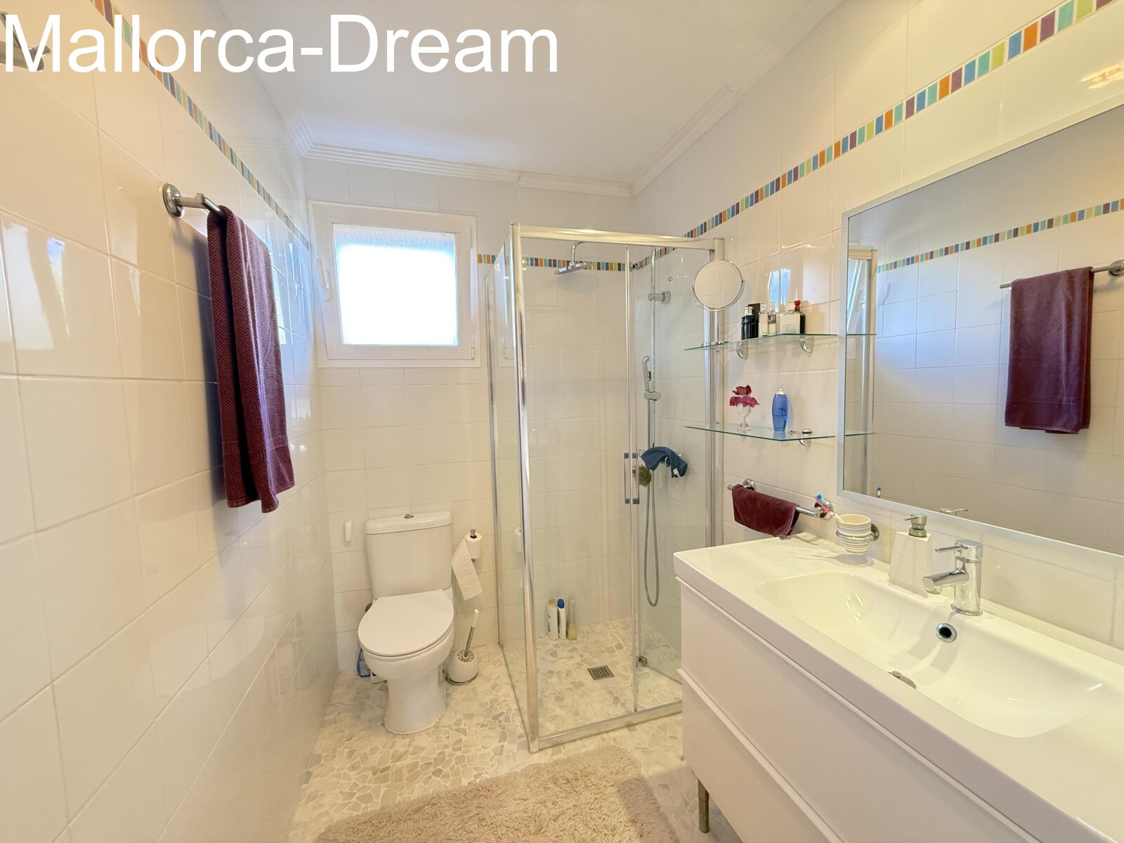 The upper floor features another bedroom with an en-suite bathroom and a large sun terrace with a built-in barbecue area, perfect for enjoying warm evenings under the Mallorcan sky.